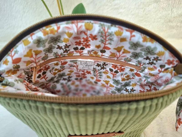 Velour Kaki et coton floral avec poche zippé, idéal pour y glisser tout votre maquillage: H 18 cm: L 21 cm: Ep 8 cm